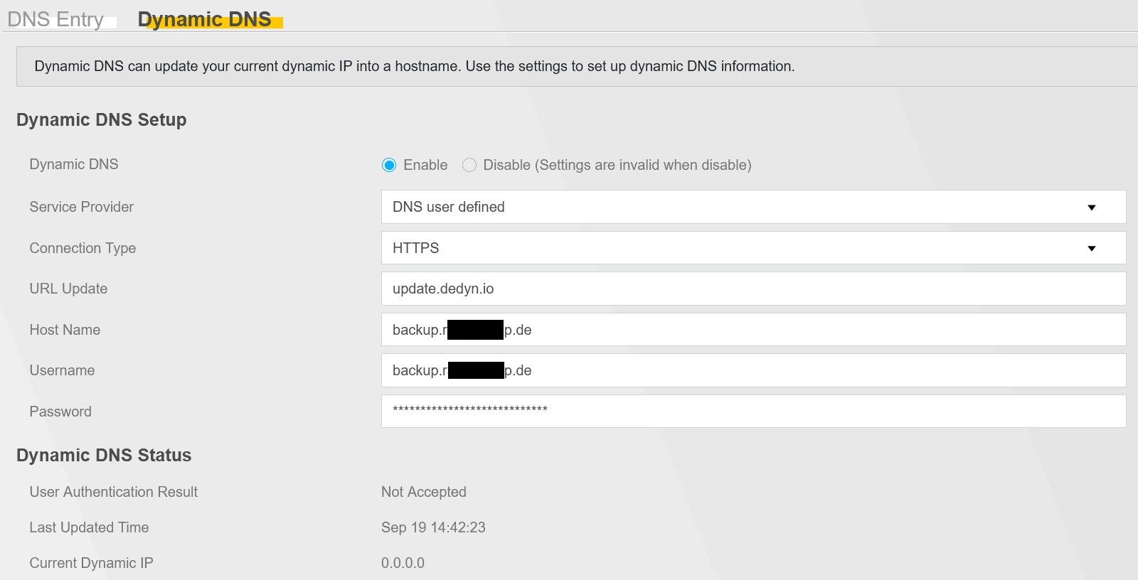 Zyxel doesn’t offer deSEC as a Service Provider but you can choose “DNS user defined”. I’ve read the documentation but I don’t get it working. Tried update.dedyn.io and https://update.dedyn.io/ as URL Update, Username with and without subdomain, different tokens, etc.