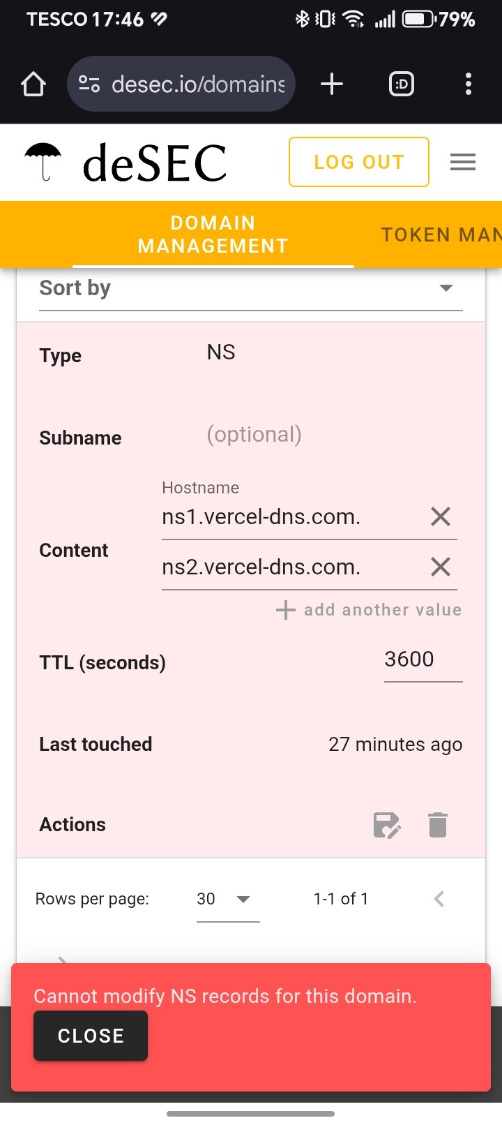 You can’t change NS records of dedyn.io subdomains. The what and why was most recently explained here.