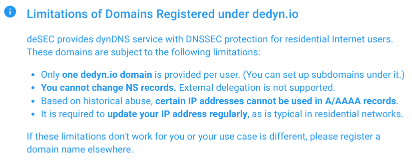 I’ve submitted a pull request that allows flagging domains as allowed for delegation instead of making it only dependent on the dedyn.io status. If merged, deSEC support could allow your domain may be delegated.