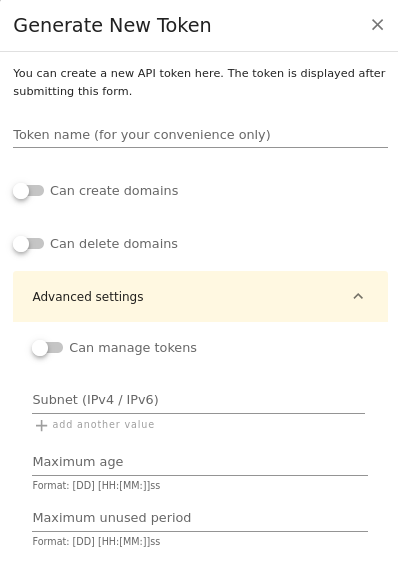 If you want to further limit what your token can do (i.e. which record types, subnames and domains it can manage), you can use deSEC’s fine-grained token policies. As far as I know the web UI can not yet display or manage them, so you’d need to use a different client.